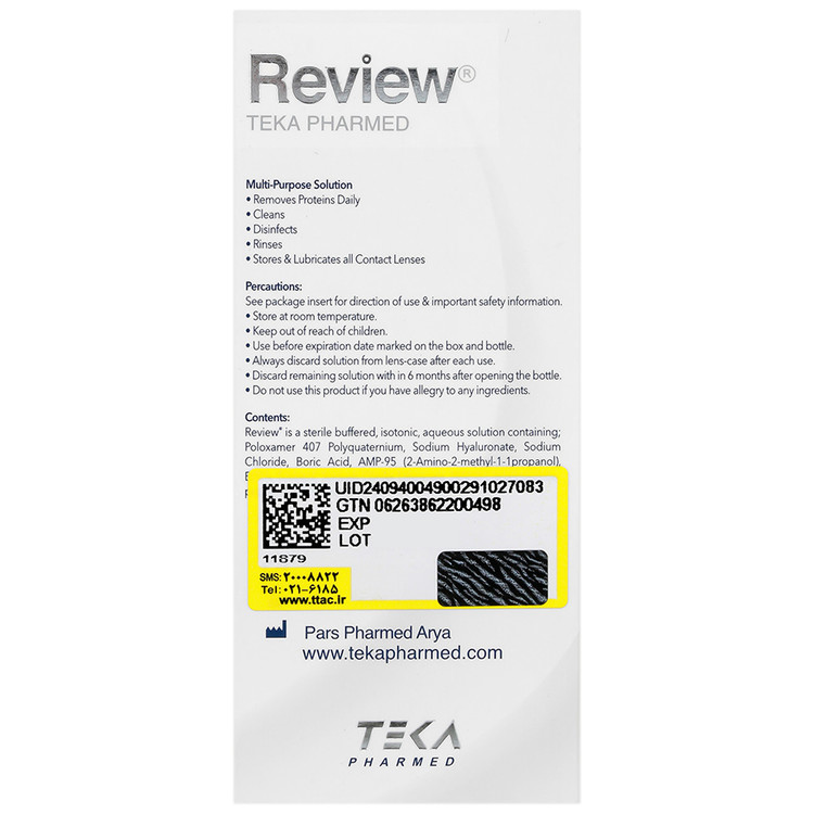 در صورت وجود حساسیت به ترکیبات محلول REVIEW از استعمال آن خودداری کنید. اقدامات احتیاطی: همیشه محلول استفاده شده را بعد از هر بار مصرف دور بریزید. همیشه درب بطری را بعد از استفاده محکم ببندید. حتماً قبل از اتمام تاریخ انقضاء درج شده روی بطری و جعبه از آن استفاده کنید. سلامت استفاده از محلول REVIEW تا شش ماه بعد از باز شدن توسط شرکت دارویی پارس فارمد آریا تضمین می شود و پس از این زمان بهتر است استفاده نشود. عوارض جانبی احتمالی محلول REVIEW: در صورت بروز سوزش چشم ،خارش، احساس شیء خارجی، اشک ریزش و قرمزی بعد از استفاده از لنز آن ها را از چشم خارج کنید. اگر ناراحتی یا مشکل بر طرف شد با دقت لنزها را بررسی کنید در صورت آسیب دیدن لنزها از استفاده مجدد لنز خودداری کنید و آنها را در ظرف لنز قرار داده و با چشم پزشک تماس بگیرید. اگر به روی لنزها مژه یا اجسام خارجی وجود داشت و لنزها سالم به نظر می آمد آن ها را کاملا تمیز شستشو و ضد عفونی کنید و دوباره استفاده کنید. در صورتی که علی رغم استفاده نکردن از لنزها، علائم فوق استمرار داشت و یا بدتر شد، ممکن است که در حال ابتلاء به بیماری مانند عفونت، زخم قرنیه، نئوواسکولاریزیسیون يا التهاب عنبيه می باشید. برای جلوگیری از صدمه به چشم، به چشم پزشک مراجعه نمایید.