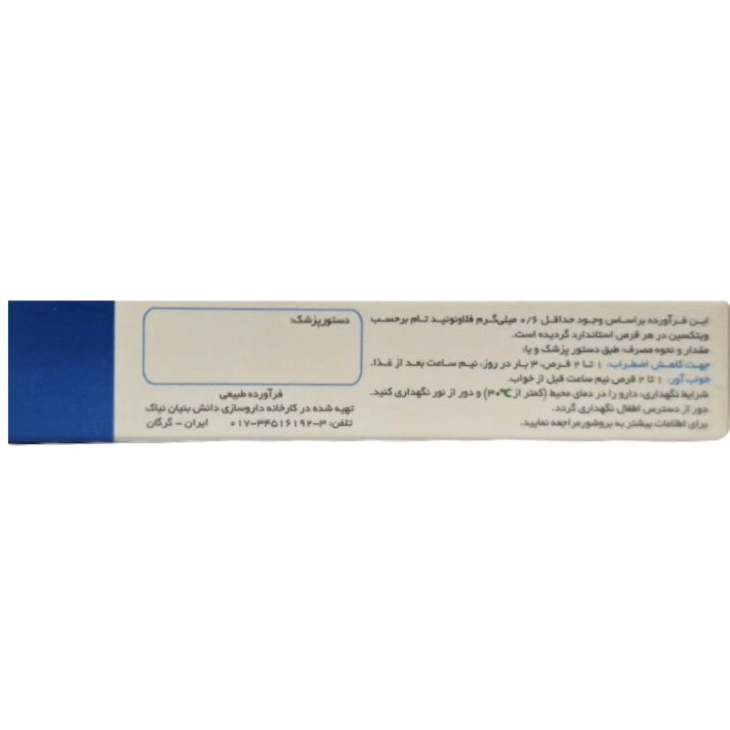 - استاندارد شده بر اساس وجود حداقل ۰/۶ میلی گرم فلاونوئید تام بر حسب ویتکسین در هر قرص