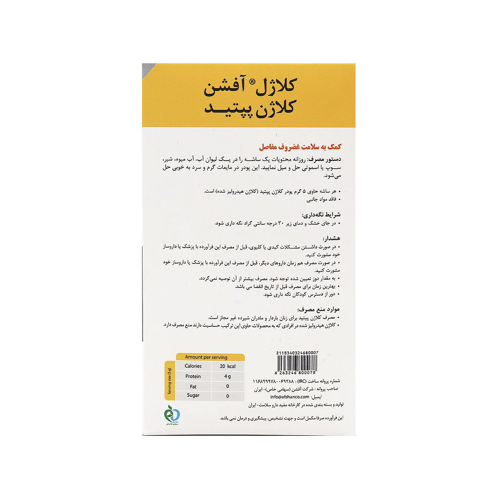 هر ساشه حاوی 5 گرم پودر کلاژن پیتید (کلاژن هیدرولیز شده)