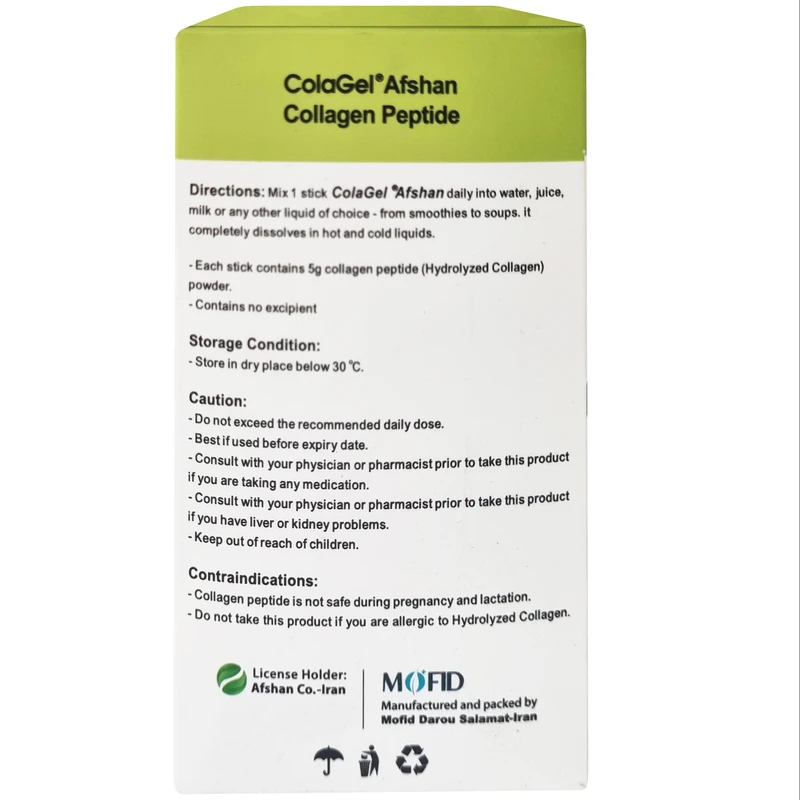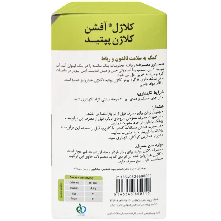 - مکمل کلاژن پپتید تاندون و رباط کلاژل افشن حاوی 5 گرم پودر کلاژن پپتید به ازای هر ساشه
