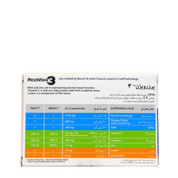 به دلیل اینکه چشم در معرض نور قرار دارد ، افزایش سن تاثیر زیادی را بر روی آن به جای می گذارد . همانطور که سن افزایش پیدا می کند و این اثرات بارزتر می شود ، شروع مراقبت های منظم از سن 50 سالگی ضرورت پیدا می کند . مصرف آنتی اکسیدان ها توصیه میشود : ویتامین C ، E و روی ، زیرا این مواد مغذی همشه به مقدار کافی در غذا یافت نمی شوند . اجزای تشکیل دهنده : محتویات کپسول - روغن ماهی غنی از امگا 3 ( DHA ) - ویتامین C ( ال - اسکوربیک اسید ) - گلیسرول مونواستئارات ( قوام دهنده ) - سوسپانسیون لوتئین استخراج شده از گل همیشه بهار - ویتامین E ( دی - ال - آلفا توکوفریل استات ) - سولفات مونوهیدرات روی - سیلیکون دی اکسید ( E 551 ) قوام دهنده - سوسپانسیون زیگزانتین استخراج شده از گل همیشه بهار اجزای تشکیل دهنده کپسول : - ژلاتین ماهی ( ماده سازنده پوشش کپسول ) - گلیسرول ( E 422 ) عامل سفت کننده رنگ دهنده ها : - اکسید آهن قرمز ( E 172 ) - اکسید آهن زرد ( E 172 )