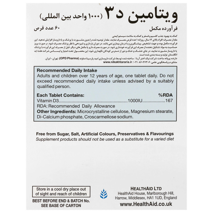قرص ویتامین دی 1000 واحدی تحت لیسانس و امتیاز شرک هلث اید انگلستانن تولید و بسته بندی شده است. ساخته شده توسط شرکت (OPD Pharma Tehran Iran)