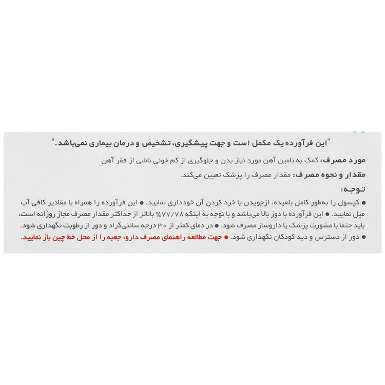 - موارد احتیاط: 1- این فرآورده با دوز بالا می باشد و با توجه به اینکه 77.78 % بالاتر از حداکثر مقدار مصرف مجاز روزانه است، باید حتما با مشورت پزشک یا داروساز مصرف شود. 2- آزمایش تشخیصی بنزیدین در هنگام مصرف آهن می تواند مثبت گردد. 3- به دلیل امکان تغییر تیره رنگ مدفوع، آزمایش وجود خون مخفی در مدفوع ممکن است مثبت شود.