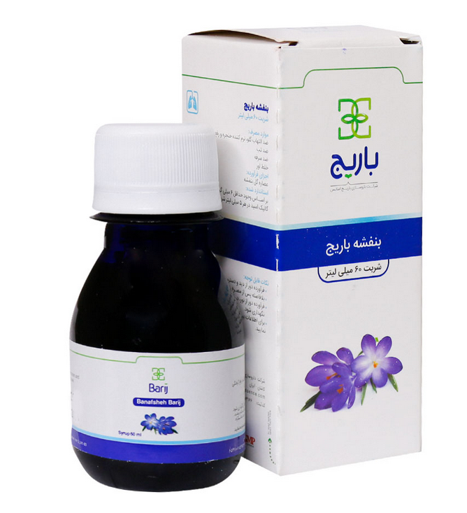 - شربت باریج بنفشه، قابل استفاده جهت کاهش خشکی سینه و کاهش شدت سرفه های خشک