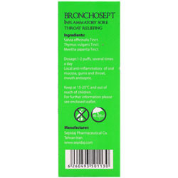 - هشدار ها و احتیاط لازم: - در صورتی که پس از استفاده از این فرآورده بهبودی مطلوب حاصل نشد به پزشک مراجعه نمایید. - توصیه می شود مصرف این فرآورده برای کودکان زیر 6 سال با نظر پزشک باشد. - از استعمال این فرآورده در چشم یا بینی خودداری نمایید. - این فرآورده به دلیل دارا بودن الکل قابل اشتعال است، به دور از شعله و حرارت نگهداری شود. - به منظور جلوگیری از آلودگی متقابل هر اسپری، فرآورده را بایستی صرفا یک فرد استفاده نماید. موارد منع مصرف: استفاده از این فرآورده در افرادی که اعتیاد به الکل دارند، منع مصرف دارد. در صورت حساسیت به هر یک از اجزا فرآورده از مصرف آن خودداری نمایید. عوارض جانبی: هر فرآورده ممکن است در کنار فواید مطلوب خود، اثرات جانبی ناخواسته ای داشته باشد که البته این اثرات جانبی ممکن است در همه بیماران رخ ندهد. به طور کلی اسپری دهان و گلو برونکوسپت بسیار سازگار با بدن می باشد، اما به واسطه دارا بودن الکل ممکن است در موضع هایی که التهاب دارد به صورت مقطعی و کوتاه مدت سوزش ایجاد کند. مصرف در دوران بارداری و شیردهی: مصرف این فرآورده در دوران بارداری و شیردهی بلامانع است.