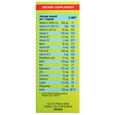 - حاوی ویتامین های A ،D3 ،C ،B12 ،B6 ،B5 ،B3 ،B2 ،B1 و E، اسیدفولیک، بیوتین، کروم، آهن، سلنیوم، روی، منیزیم، مس، ید و منگنز