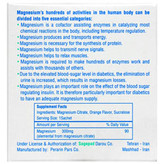 - تداخلات دارویی منیزیم در مصرف همزمان با داروهای زیر می باشد: - دیورتیک ها (ادرار آور ها) مانند لازیکس - داروهای ضد سرطان مانند سیس پلاتین - تتراسیکلین ها - آنتی بیوتیک هایی مانند جنتامایسین - در صورت استفاده از مقدار توصیه شده هیچ گونه عوارض جانبی مشاهده نشده است مگر در کسانی که نسبت به مواد به کار رفته در فرآوره حساسیت داشته باشند که باعث عوارض گوارشی می شود. - منیزیم در مصرف بیش از اندازه اثرات ملین دارد. - افرادی که مشکلات کلیوی و کبدی دارند زیر نظر پزشک استفاده نمایند. - لطفا بیش از دوز درمانی استفاده نگردد. در صورت فراموشی یک دوز درمانی، میزان مصرف دوز بعدی را دوبرابر نکنید.