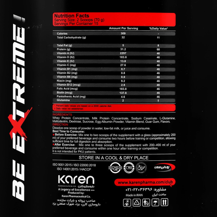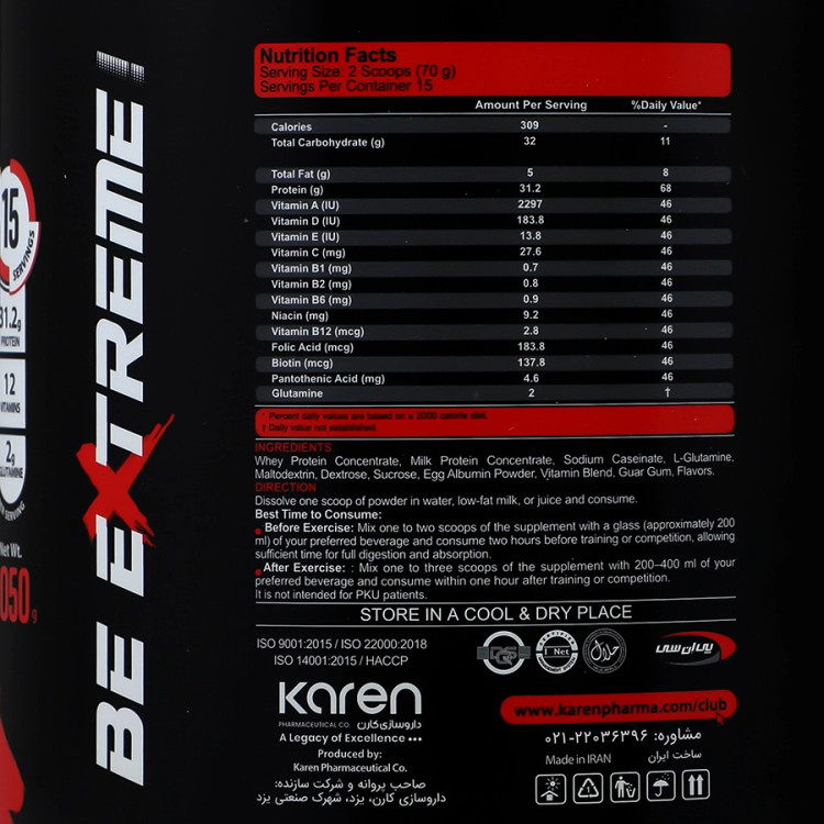 هر 2 پیمانه پودر (70 گرم) را در یک لیوان (200 میلی لیتر) آب یا شیر حل کرده و 1 تا 2 پیمانه حداقل 2 ساعت پیش از تمرین و 1 تا 3 پیمانه پودر حداکثر یک ساعت پس از تمرین مصرف شود.