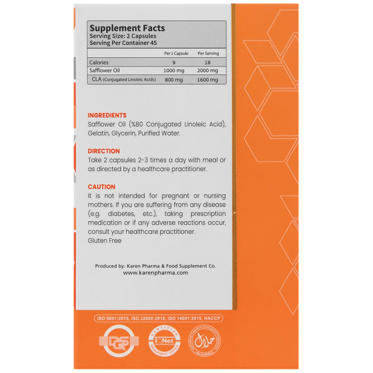 - سی ال ای 1600 میلیگرم کارن حاوی اسید چرب امگا 6 غیر اشباع (اسید لینولئیک کنژوگه) است.