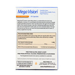 مگاویژن و مگاویژن پلاس، دو مکمل با کیفیت در زمینه مراقبت از چشمها و سیستم بینایی هستند که با فرم دارویی کپسول، تحت برند هلث اید انگلستان تولید شدهاند. تفاوت این دو مکمل در ترکیبات آنها است. مگاویژن، حاوی 40 میلیگرم لوتئین به ازای هر کپسول خود بوده در حالی که مگاویژن پلاس علاوه بر 40 میلیگرم لوتئین، دارای 7 میلیگرم زاگزانتین نیز است.