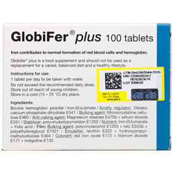روزانه یک یا دو قرص همراه با یک لیوان آب به طور کامل بلعیده شود. (حداقل یک دوره 3 ماهه پیشنهاد می شود. مکمل گلوبیفر پلاس را می توان در مدت طولانی تری برحسب نیاز با مشورت پزشک استفاده کرد.) مصرف بیش از مقدار پیشنهادی توصیه نمی گردد.ترکیبات: