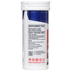 نقش ویتامین C در سلامت: - در تشکیل کلاژن: ویتامین C در بدن در تشکیل کلاژن در استخوان ها، غضروف، عضله و رگ های خونی اهمیت داشته و نیز در جذب آهن نیز شرکت می کند. تأثیر ویتامین C در تشکیل کلاژن مهم ترین نقش آن است. کلاژن یک ماده پروتئینی می باشد که سلول ها را در کنار هم نگه می دارد و اختلال در سنتز کلاژن می تواند موجب تأخیر در بهبود زخم ها گردد. - درحفظ سلامت پوست: یکی از مهمترین ترکیبات موجود در داروهای مؤثر در سلامت پوست، ویتامین C می باشد. این ویتامین موجب مرطوب نمودن پوست و تحریک رشد کلاژن در آن گردد. همچنین به پوست لطافت بخشیده و در از بین بردن چین و چروک آن نیز مؤثر است. همانگونه که می دانیم، کلاژن موجب ساختار و قدرت بخشیدن به پوست می گردد. با افزایش سن، بطور طبیعی سنتز کلاژن در پوست کاهش یافته و موجب ظاهر شدن چین و چروک می گردد، لذا تحریک تولید کلاژن توسط ویتامین C این فرایند را تا حدودی کند می کند. ویتامین C در پوست بعنوان آنتی اکسیدان نیز عمل می کند. زمانیکه پوست در معرض اشعه ماورای بنفش آفتاب قرار می گیرد، رادیکال های آزاد تشکیل شده و به آن آسیب رسانده و می توانند حتی باعث ایجاد سرطان در پوست گردند. - در افزایش توان و سلامت عمومی بدن: ویتامین C موجب سرعت بخشیدن در بهبود زخم ها و محافظت از بدن در برابر استرس های فیزیکی و ذهنی می گردد. همچنین تا حدودی از بروز آسیب های ناشی از مواد شیمیایی سمی در محیط و غذا و آب ممانعت کرده و تأثیرات سمی داروها را نیز خنثی می نمایند. کمبود ویتامین C : کمبود ویتامینC موجب نرم شدن لثه ها، خونریزی های پوستی، ضعیف شدن مویرگ ها، تخریب کلاژن، کم خونی یا آنمی و نیز کاهش روند بهبود زخم ها گردد. همچنین پیری زودرس، نارسائی تیروئیدی و کاهش مقاومت به عفونت ها نیز از علایم دیگر است. تقویت تأثیر منفی مواد سمی و داروها و نیز مواد آلاینده محیطی در بدن نیز ممکن است بروز کند. در صورتیکه کمبود ویتامین C خفیف باشد، علایم دیگری چون ضعف، خستگی، بی اشتهایی، درد عضلانی و افزایش حساسیت نسبت به عفونت ها بروز می کند. در صورتیکه کمبود ویتامین C بصورت مزمن در بیاید، منجر به بیماری اسکوروی می گردد. علائم این بیماری عبارتند از: خون ریزی های مکرر، ریزش مو و دندان ها، درد مفاصل و تورم ناشی از ضعیف شدن رگ های خونی، بافت پیوندی و استخوان که این بافت ها حاوی کلاژن هستند. اسکوروی در کشورهای توسعه یافته به ندرت دیده می شود، چون می توان با مصرف 10 میلی گرم در روز از ویتامینC از بروز آن جلوگیری نمود. مواد جانبی: اسید سیتریک، سدیم بی کربنات، پوویدون کا30، پلی اتیلن گلیکول، سوکر الوز، لاکتوز، کینولین، طعم دهنده پرتقال.