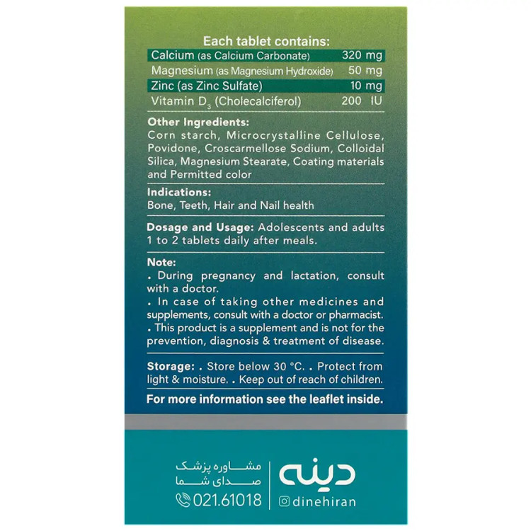 - حاوی 320 میلی گرم کلسیم، 50 میلی گرم منیزیم، 10 میلی گرم زینک و 200 واحد بین المللی ویتامین D3