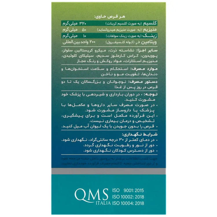 - موارد منع مصرف: سابقه حساسیت به کلسیم، زینک و منیزیم و D یا هر کدام از اجزای این فراورده.