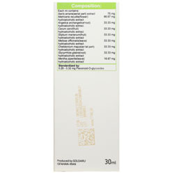 - حاوی عصاره اندام هوایی آیبریس، عصاره های هیدروالکلی گیاهان شامل گل های بابونه شیرازی، ریشه سنبل خطائی، میوه زیره، میوه خار مریم، برگ بادرنجبویه، اندام هوایی مامیران، ریشه شیرین بیان و برگ نعناع فلفلی