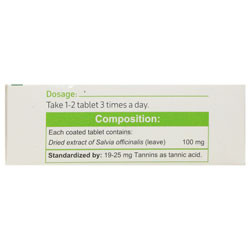 - هر قرص حاوی 100 میلی گرم عصاره خشک سرشاخه های جوان گیاه مریم گلی (Salvia officinalis)