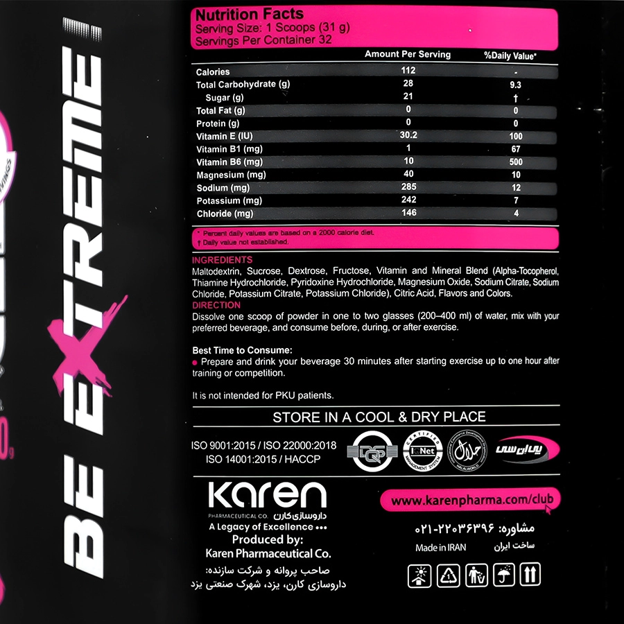 - نوشیدنی ورزشی ایزوتونیک کربو شارژ، حاوی سدیم، پتاسیم، منیزیم و کلر، بهبود دهنده تعادل الکترولیتی ورزشکار حین تمرین