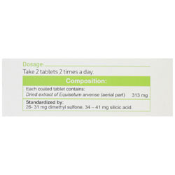 - هر قرص محتوی 3/3 میلی گرم عصاره خشک اندام هوائی گیاه دم اسب (Equisetum arvense) استاندارد شده براساس 31-26 میلی گرم دی متیل سولفون و 41-34 میلی گرم اسید سیلیسیک