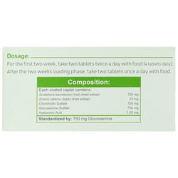 - حاوی عصاره خشک گیاه قاشقک، 100 میلی گرم، عصاره خشک کاد هندی 25 میلی گرم، سولفات کندروایتین 100 میلی گرم، سولفات گلوکوزامین 750 میلی گرم و اسید هیالورونیک 1.65 میلی گرم