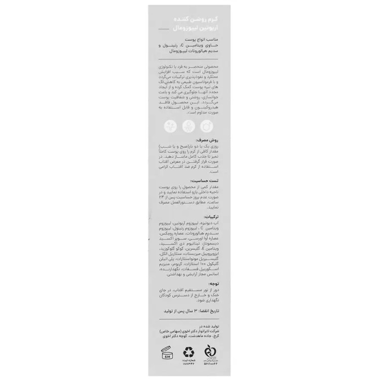 موارد احتیاط: از تماس با چشم، پلک و غشاهای مخاطی اجتناب شود. استفاده از کرم در تمام نقاط صورت و بدن و سایر مناطق بلامانع می باشد زیرا علاوه بر خاصیت ضدلک بودن، یک روشن کننده موضعی نیز می باشد مصرف همزمان با کرم ویتامین Cسی گل بعلت القای اثرات سینرژیک در روشن کنندگی ، توصیه می گردد مواد اصلی تشکیل دهنده: لیپوزوم آربوتین (Arbutin) ملفید (Melfade-J) رومکس(Rumex) لیپوزوم رتینول لیپوزوم ویتامینهای C و E هیالورونات سدیم دیسموتاز