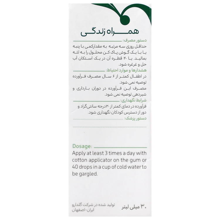حداقل روزی سه مرتبه به مقدار کمی با پنبه یا با یک گوش پاک کن محلول را به لثه بمالید یا 40 قطره آن در یک لیوان آب حل و قرقره شود.