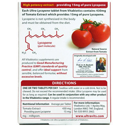 قرص اولترا لیکوپن حاوی 200 میلی گرم عصاره گوجه فرنگی که تامین کننده 15 میلی گرم لیکوپن خالص است. لیکوپن ماده ای است که در بدن ساخته نمی شود و باید از طریق غذا در یافت شود.