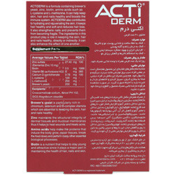 اکتی درم یک مکمل غذایی حاوی مخمر آبجو، اسیدهای آمینه السیستئین و المتیونین، ویتامینهای B5 ،B6 و بیوتین بههمراه زینک است که به سلامت پوست، مو و ناخنها و تقویت سیستم ایمنی بدن کمک میکند.
