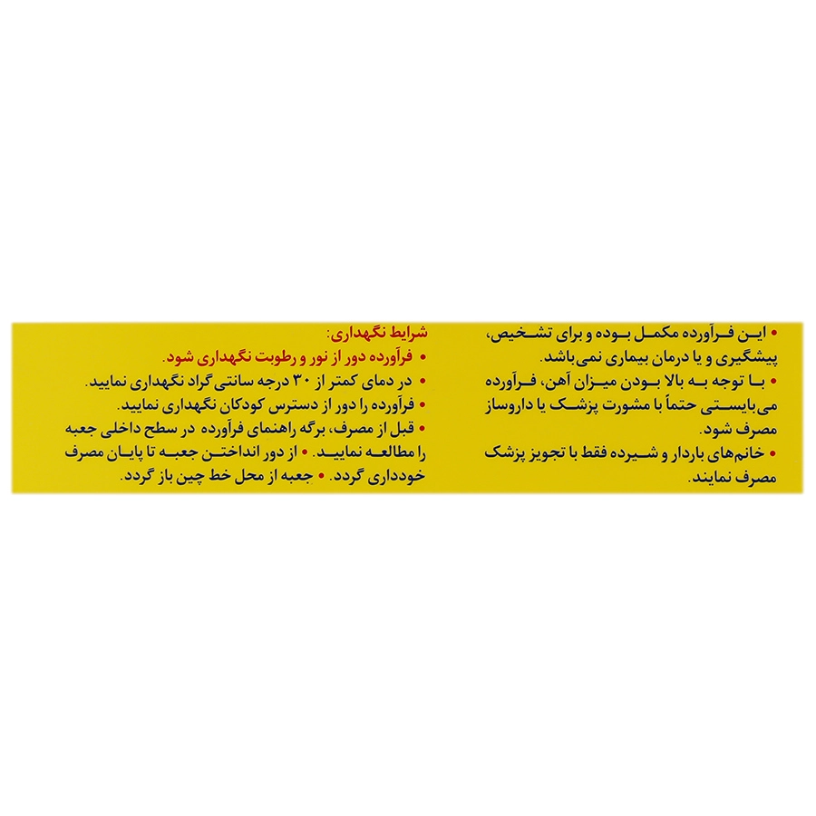 - هشدارها و احتیاطات: - در صورت مصرف فرآورده دارویی دیگر قبل از مصرف با پزشک و یا داروساز مشورت شود. - وجود هر نوع حساسیت به آهن، فولیک اسید، روی و یا موادی مانند غذاها، رنگ ها و یا مواد محافظ با پزشک و یا داروساز مشورت شود. - این فرآورده با دوز بالا می باشد و با توجه به اینکه میزان آهن 6.7 درصد بالاتر از حداکثر مقدار مجاز روزانه است می بایستی حتما با مشورت پزشک مصرف شود.