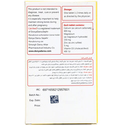 - هر دو قرص شامل: کلسیم 800 میلی گرم ، منیزیم 300 میلی گرم، زینک 10 میلی گرم و ویتامین د 800 واحد بین الملل