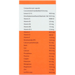 - مکمل مولتیویتامین-مینرال حاوی ویتامینهای A، C، D، E و ویتامینهای گروه B، مواد معدنی، عصاره جینسنگ، روتین و لسیتین سویا