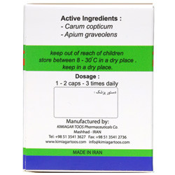 میوه کرفس به دلیل درصد بالای اسانس دارای خاصیت ضد اسپاسم بوده و بدلیل دارا بودن بوتیل فتالید و متیل فتالید و بعضی از کومارین ها دارای خاصیت مدری و آرامبخشی می باشد . همچنین عصاره زنیان با اثرات ضد نفخ ، ضد تهوع و ضد اسپاسم که به واسطه تیمول و کارواکرول و آلفا پینن ایجاد می شود موجب تنظیم حرکات و شیره های گوارشی می گردد . سایر مواد معطر موجود در عصاره زنیان باعث رفع بوی بد دهان و مدفوع می شود .