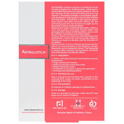 - آرترولیستیکا فرآورده طبیعی حاوی عصاره انگورفرنگی سیاه، عصاره چای ترش، بیوفلاونوییدهای لیمو و ویتامین E