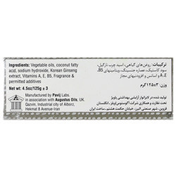 ترکیبات : روغن پالم، تالو، اسید چرب نارگیل، روغن بادام، سود کاستیک، لانولین، ویتامین A, E, B5 و جنسینگ خواص گیاه جنسینگ : در تولیدات آرایشی و بهداشتی استفاده می شود و عملکرد جنسینگ روی سیستم ایمنی بدن مفید می باشد و دارای اثرات ضد اشعه قوی (Anti-Radical) بوده و جلوگیری از چین و چروک پوست می نماید و برای بهینه کردن متابولیسم پوست بدن و جوان کردن و شاداب کردن آن مفید می باشد همچنین به عنوان آنتی اکسیدان قوی به شمار می رود.