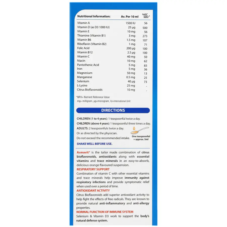 آسماویت یک مکمل تغذیهای مولتی ویتامین-مینرالی به شکل شربت است که اسیدآمینه لیزین و بیوفلاوونوئیدهای مرکبات نیز دارد. این شربت علاوه بر تأمین ویتامینها و مواد معدنی ضروری بدن، به تقویت سیستم ایمنی، بهبود رشد جسمی و ذهنی، افزایش اشتها و ارتقای سلامت عمومی بدن کمک میکند. آسماویت با طعم پرتقال در بطری شیشهای 200 میلیلیتری توسط شرکت ویتا آریا در ایران تولید میشود.