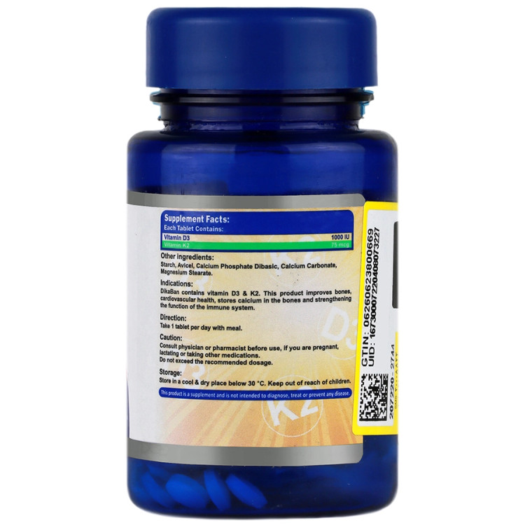 محصول دی کابان با فرهم کردن دوز مناسب روزانه از ویتامین D3 و K2 حداکثر مزیت و اثر را در سلامت استخوان ها خواهد داشت. از ویژگی های محتویات این محصول می توان به موارد زیر اشاره کرد: ویتامین D3: یک ویتامین محلول در چربی می باشد که با افزایش جذب کلسیم و فسفر از روده ها و کاهش دفع آن ها از کلیه، فرآیند استخوان سازی را قوت می بخشد. در واقع بدون ویتامین D استخوان ها نازک و شکننده می شوند. تولید ویتامین D در معرض تابش اشعه ماورای بنفش خورشید در پوست انسان یکی از عمده ترین منابع تامین آن برای بدن می باشد. امروزه با توجه به تغییر شرایط محیط زیست و سبک زندگی افراد، تماس کافی با نور UVB امکان پذیر نمی باشد. بنابراین کمبود ویتامین D در ایران شیوع بالایی پیدا کرده است. مطالعات در طول سالهای اخیر نشان داده که درصد زیادی از مردم کمبود ویتامین دی دارند. همچنین ویتامین D3 در حفظ سلامت قلب و عروق و تقویت سیستم ایمنی بدن نیز نقش موثری دارد. ویتامین K2: این ویتامین نیز یک ویتامین محلول در چربی می باشد که با فعال کردن استئوکلسین ( پروتئینی در خون که مسئول اتصال یون های کلسیم به ماتریکس استخوان می باشد) باعث افزایش جذب کلسیم به استخوان شده و استحکام استخوان و کاهش احتمال شکستگی را به دنبال دارد. همچنین ویتامین K2 از رسوب نابجای کلسیم در شریان ها، مفاصل، قلب و کلیه جلوگیری می کند.