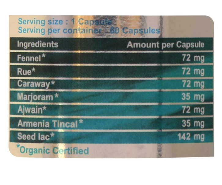 - حاوی زیره سیاه، زنیان، رازیانه، لاک مغسول ، سرشاخه گلدار سداب، سرشاخه مرزن جوش و بوره ارمنی