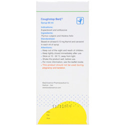 - مواد موثره: تیمول، هدراکوزید C اجزاء فرآورده: عصاره آویشن (Thymus Vulgaris) و عشقه (Hedera Helix)