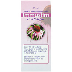 هر 100 میلی لیتر محلول خوراکی ایموستیم حاوی 80 گرم شیرابه تازه اندام هوائی گلدار گیاه purpurea Echinacea استاندارد شده: بر حسب 1.72-1.27 میلیگرم ترکیبات فنولیک بر حسب کلروژنیک اسید در هر میلی لیتر