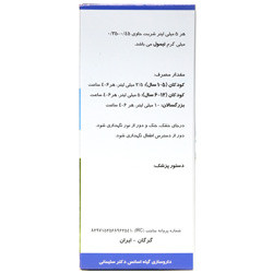 کودکان ( 5-1 سال ) : 2.5 میلی لیتر ( یک قاشق چایخوری ) هر 6-4 ساعت کودکان ( 12-6 سال ) : 5 میلی لیتر ( یک قاشق مرباخوری ) هر 6-4 ساعت بزرگسالان : 10 میلی لیتر ( یک قاشق غذاخوری ) هر 6-4 ساعت