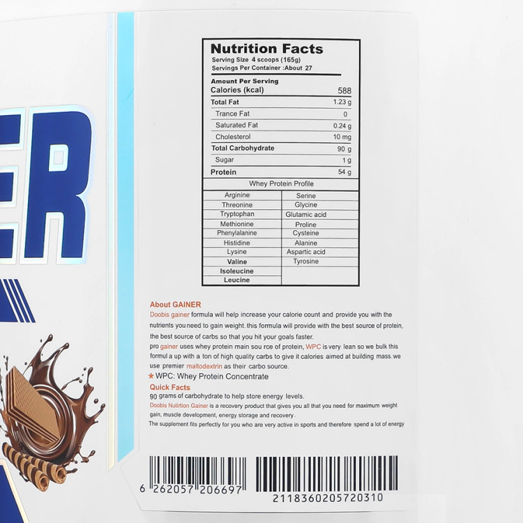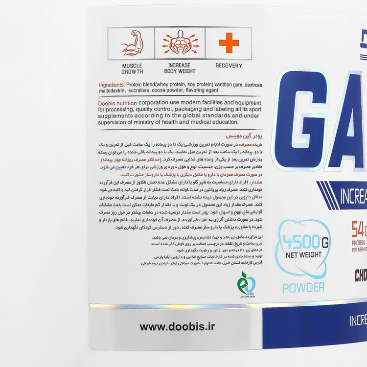 - گینر دوبیس، حاوی نسبت کربوهیدرات به پروتئین تقریبا 1.8 به 1