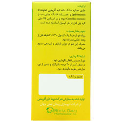- عوارض جانبی: در صورت رعایت دوز مصرفی پیشنهاد شده هیچگونه عوارض جانبی ایجاد نخواهد کرد مگر بیمارانی که نسبت به گیاه به کار رفته در دارو حساسیت داشته باشند. موارد عدم مصرف و نکات قابل توصیه: - استفاده ی زیاد از چای سبز اثر وارفارین را کاهش داده و خطر لخته شدن خون را افزایش می دهد. - مصرف چای سبز فشار داخلی چشم را افزایش می دهد لذا در بیماران مبتلا به گلوکما استفاده نشود. - استفاده ی بیش از حد از چای سبز ممکن است به کبد آسیب برساند.