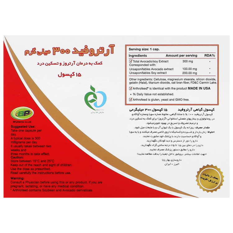 - عوارض جانبی : کپسول آرتروفید منشا گیاهی دارد و با دوز توصیه شده عوارض جانبی گزارش نشده است ، اما کسانی که نسبت به سویا یا آووکادو مواد بکار در فرآورده حساسیت دارند از مصرف آن خودداری نمایند.