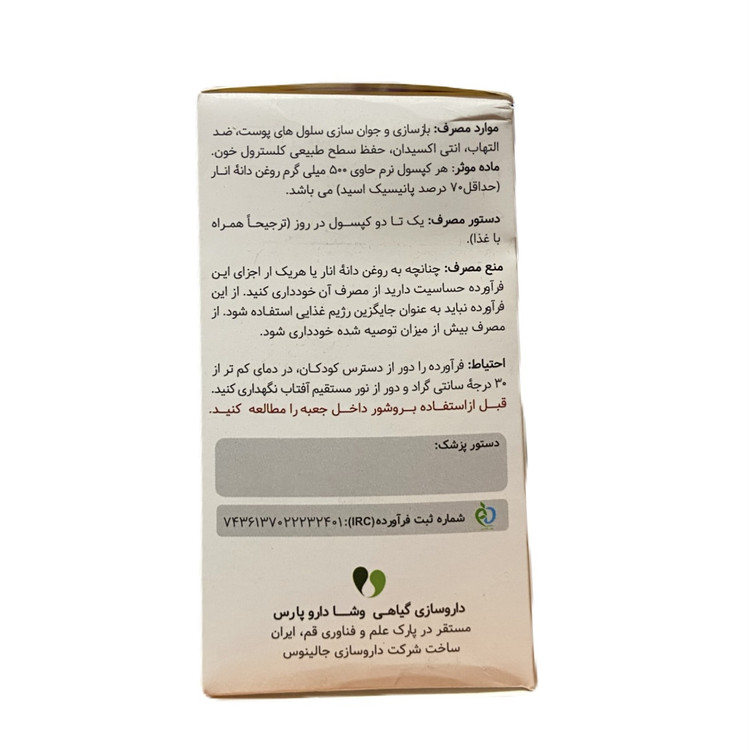 - هر کپسول نرم حاوی 500 میلی گرم روغن دانه انار (حداقل 70 درصد پانیسیک اسید)