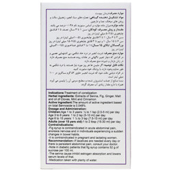 حاوی 0.5 درصد عصاره خشک برگ سنا با نام علمی Cassia angustifolia و 5 درصد عصاره میوه انجیر با نام علمی Ficus carica است. مواد تشکیل دهنده گیاهی: عصاره های سنا، انجیر، زنجبیل، مالت و روغن های میخک، نعنا و دارچین ماده موثره: میزان ماده موثره براساس سنوزید تام 0.048 درصد می باشد.
