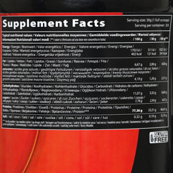 حاوی پروتئین وی ایزوله، کنسانتره و هیدرولیز حاوی 46 گرم پروتئین، 7 گرم کربوهیدارت و 4 گرم چربی در هر دو سروینگ (60گرم) حاوی 33 سروینگ همراه با شیرین کننده فاقد گلوتن