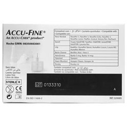 سر سوزن تزریق انسولین آکیو فاین سایز Accu-Fine 4mm بدون لاتکس و دارای روکشی است که موجب تسهیل ورود سوزن به پوست میشود. این محصول دارای تکنولوژی دیواره نازک برای تزریق یکنواخت انسولین نیز میباشد. سر سوزن تزریق انسولین آکیو فاین استریل است و با انواع قلمهای انسولین سازگار است.