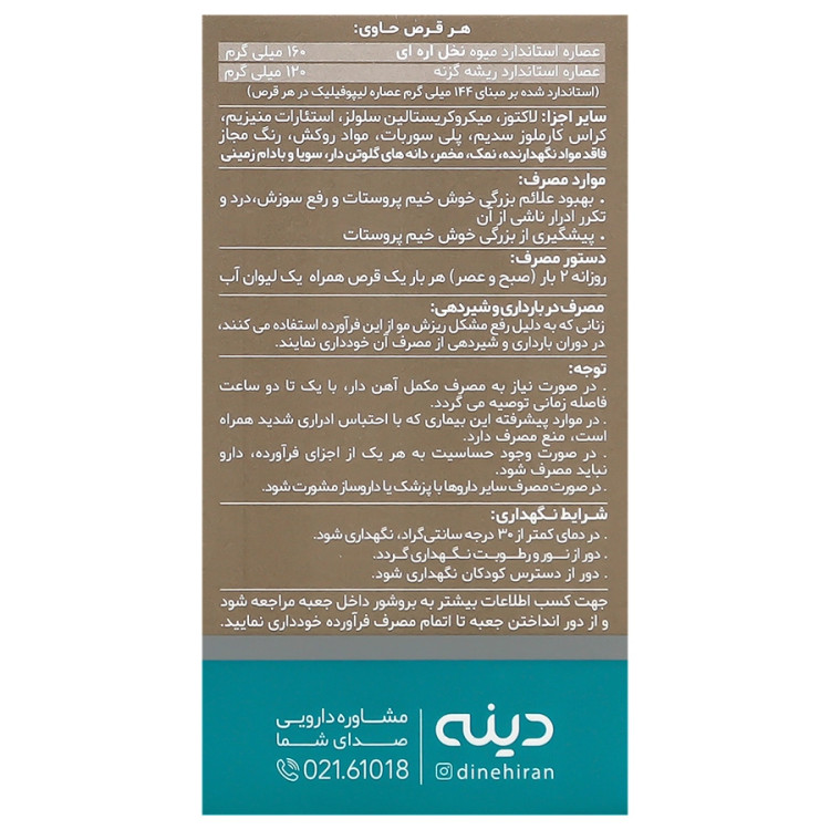 - هر جعبه از قرص پروستادین دینه، مناسب برای استفاده 25 روز