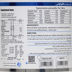 ترکیبات: وی پروتئین کنسانتره، شیرین کننده، رنگ و طعم دهنده مجاز خوراکی.
