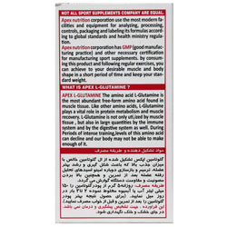 گلوتامین اپکس تشیکل شده از ال گلوتامین خالص با میزان جذب بالا که باعث شکل گیری و رشد بهتر عضله، ترمیم و بازسازی دوباره امینو اسیدهای تحلیل رفته عضله بعد از تمرین و همچنین بالا بردن مصونیت و مقاومت دستگاه گوارش می گردد.