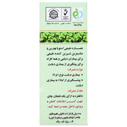عصاره شیرین کننده طبیعی استویا حاوی اسانس های معطر طبیعی و طبی خوارکی استاندارد شده، هر 5 میلی لیتر حاوی 5 میلی گرم استویوزید